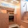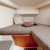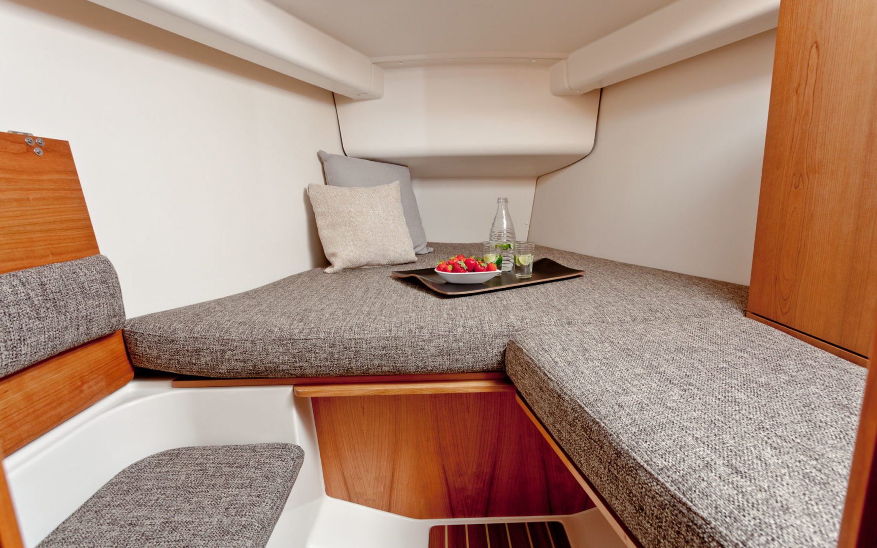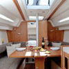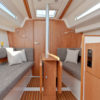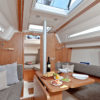 A fedélzeten kézzel foghatóvá válik az „ügyes térkihasználás” kifejezés. Az önváltós fock ékes bizonyítéka annak, hogy a gyár nem csak beszél a „könnyű kezelhetőségről”. A nagyvitorla behúzója szinté sínen mozog, így a grósz állíthatósága jobb azokhoz a hajókhoz képest, ahol ilyen megoldás nincs. Bár a tat nyitott, a cockpit védettnek tekinthető, már csak azért is, mert a lehajtható fürdőplatform zárja le a teret. Amikor épp nem, akkor pedig jó szolgálatot tesz, mint gyerekeknek szánt játszótér vagy napozóterasz. Odabent világos és tágas a tér.