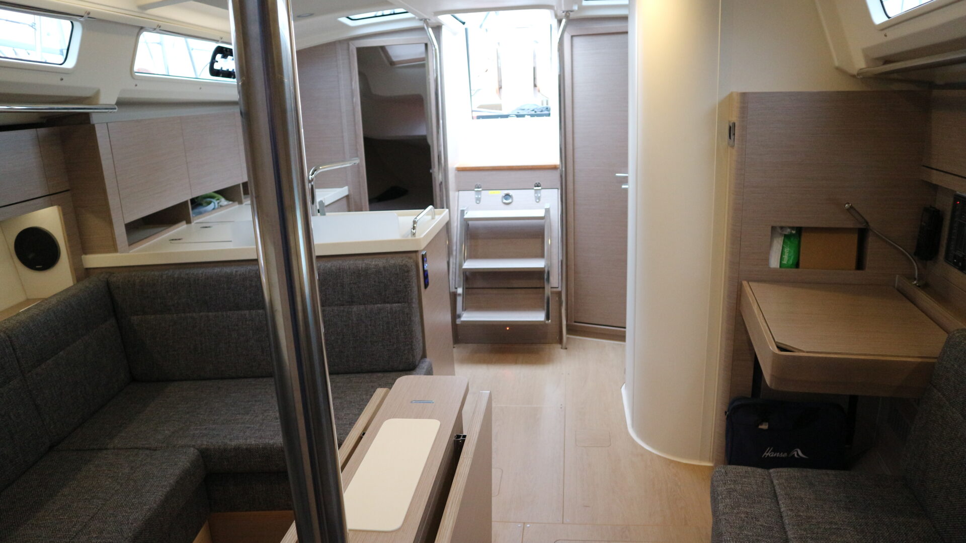 Ez a Hanse vitorlás új lehetőségekkel teli világot nyit meg bérlője előtt. Méretes vitorlafelülete és optimálisan kialakított hajóteste gyorsan repíti a cél felé, miközben utasai teljes biztonságban vannak – tartózkodjanak bárhol a fedélzeten. Vízvonala – függetlenül az aktuális dőlésszögtől – a lehető leghosszabb, ami szintén a tempós haladás feltétele. Ugyanakkor – a függőleges orral és tattal – maximalizálja a belső tér méretét. Minimalista dizájnja jól tükrözi a hajó egyszerű kezelhetőségét: az összes kötelet hátravezettük a kormányállásba, így egy személy el tudja irányítani a vitorlást.